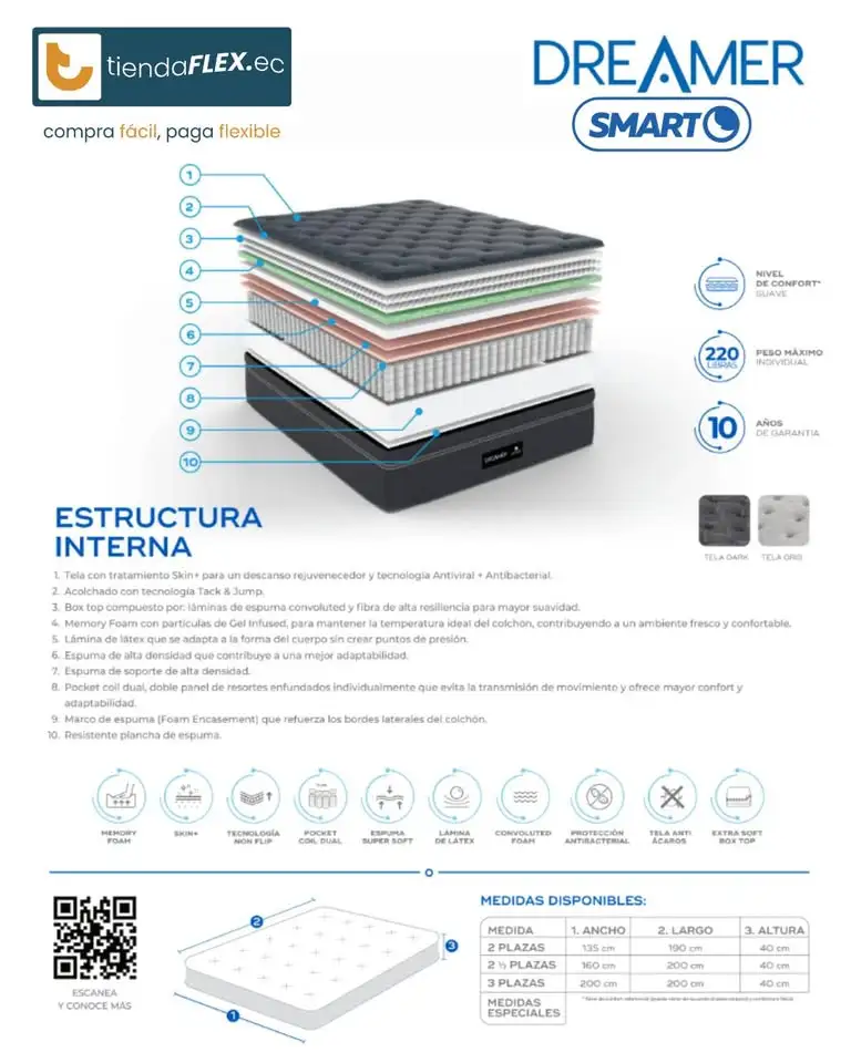 Disfruta del confort total con el Colchón Dreamer GR-Dark Smart de Chaide & Chaide. Su innovadora tecnología y materiales premium aseguran un descanso profundo y reparador para empezar el día con energía. ¡Es la opción perfecta para tu bienestar!