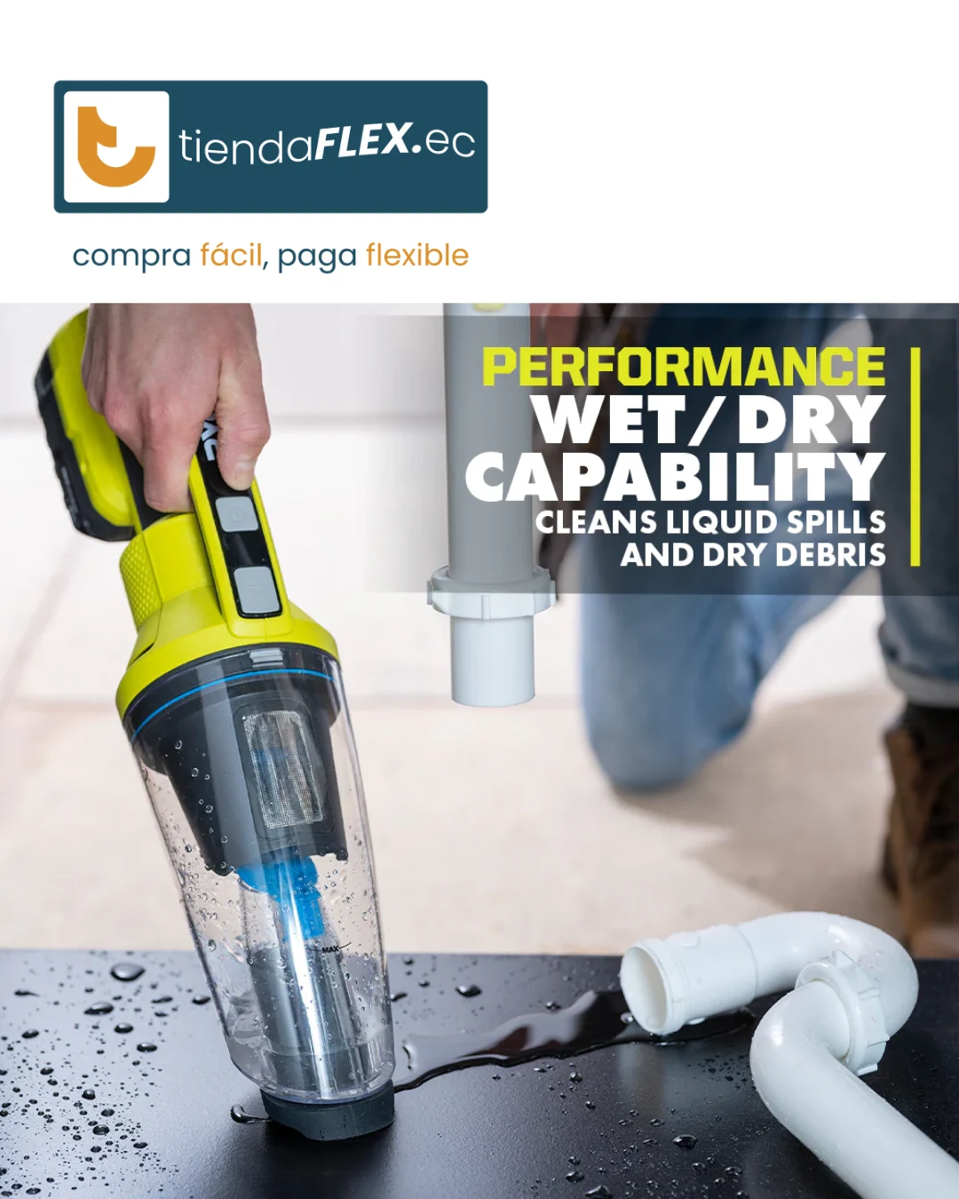 ¡Limpia derrames y residuos secos donde sea que estés! Potente, compacta y parte del sistema RYOBI ONE+ 18V.»