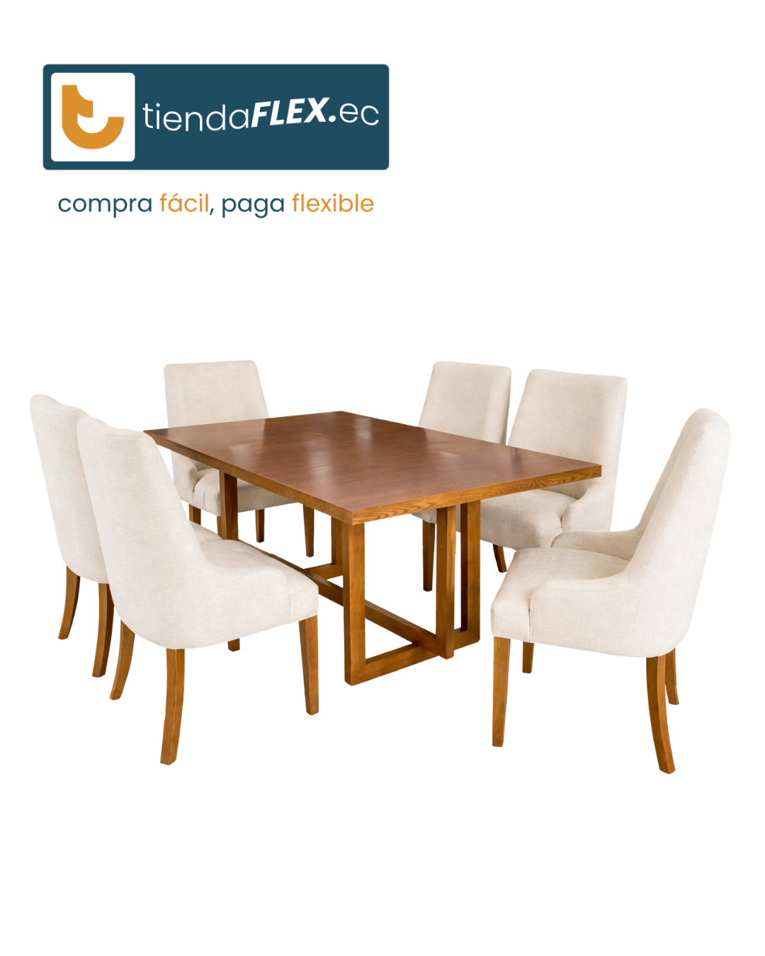 Clásico moderno que nunca pasa de moda. Este comedor combina madera con tapiz beige cálido, creando un ambiente acogedor y elegante para compartir en familia.