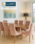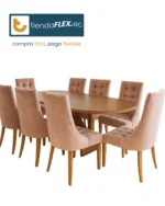 Un comedor con presencia, textura y personalidad. El Comedor Valenthia destaca por sus sillas tapizadas capitoneadas que invitan al confort y su estructura robusta de madera oriental que garantiza durabilidad. Ideal para hogares que buscan un toque de distinción en cada detalle.