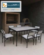 Pensado para espacios al aire libre como zonas BBQ, terrazas o jardines, el Comedor Zákros combina estructura metálica, piedra sinterizada y tapizado antifluido para ofrecer elegancia, durabilidad y fácil mantenimiento, sin sacrificar estilo.